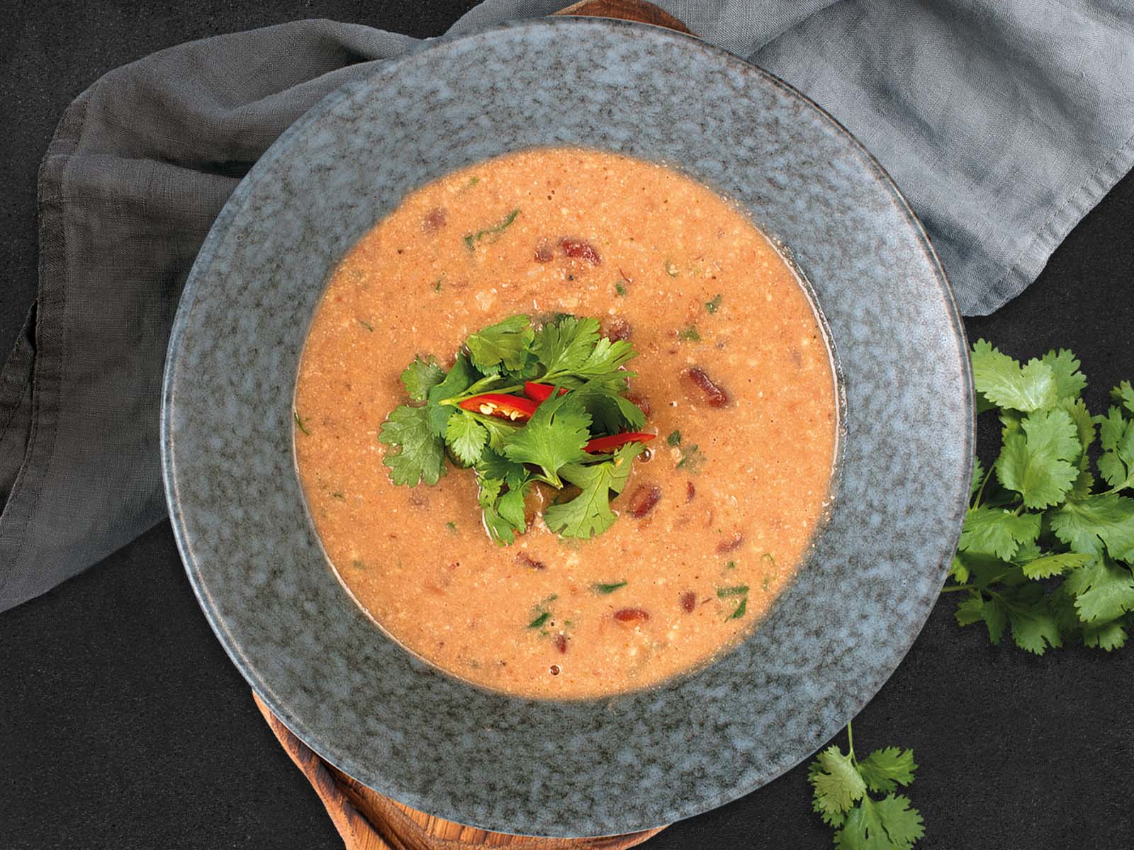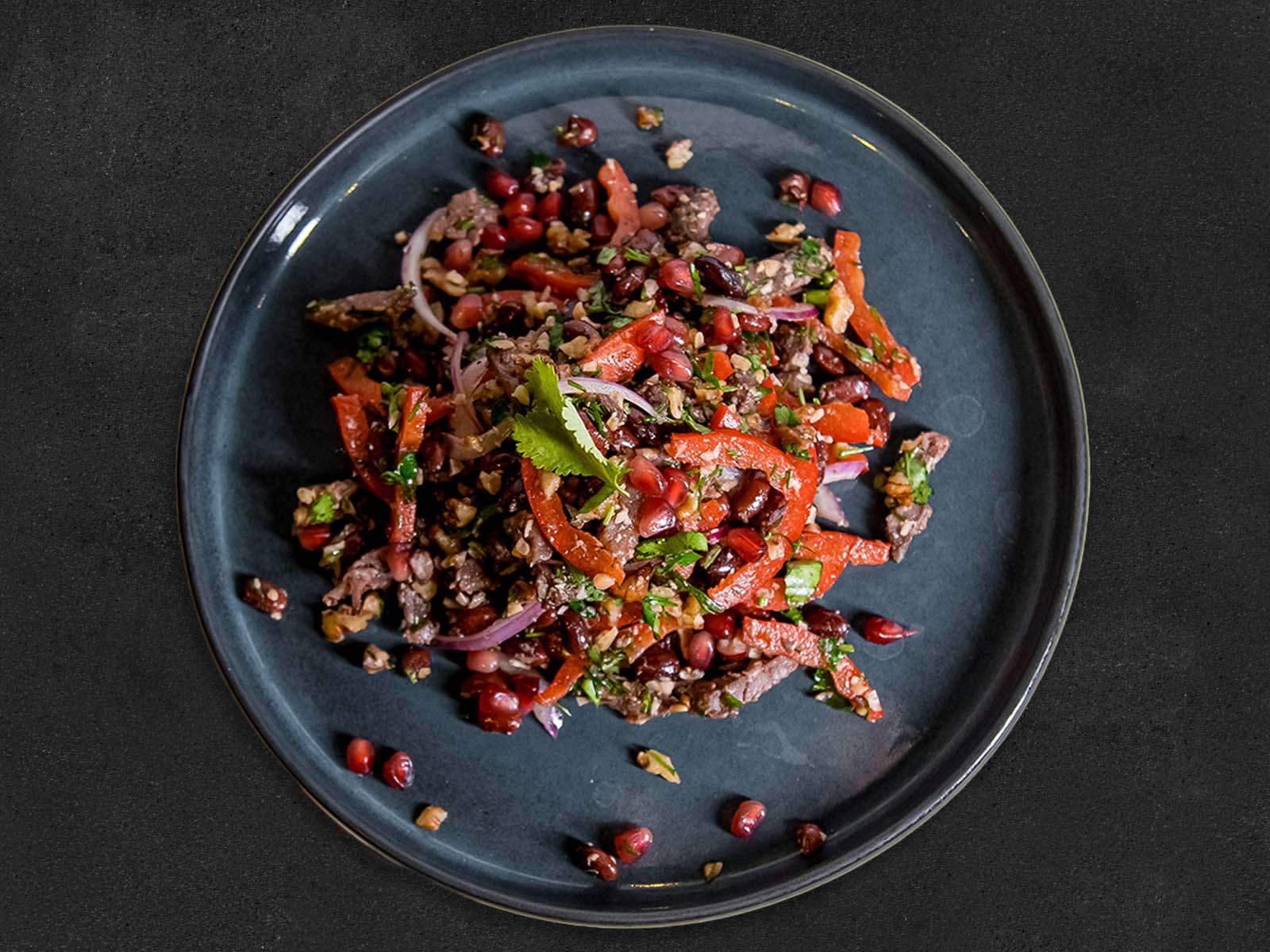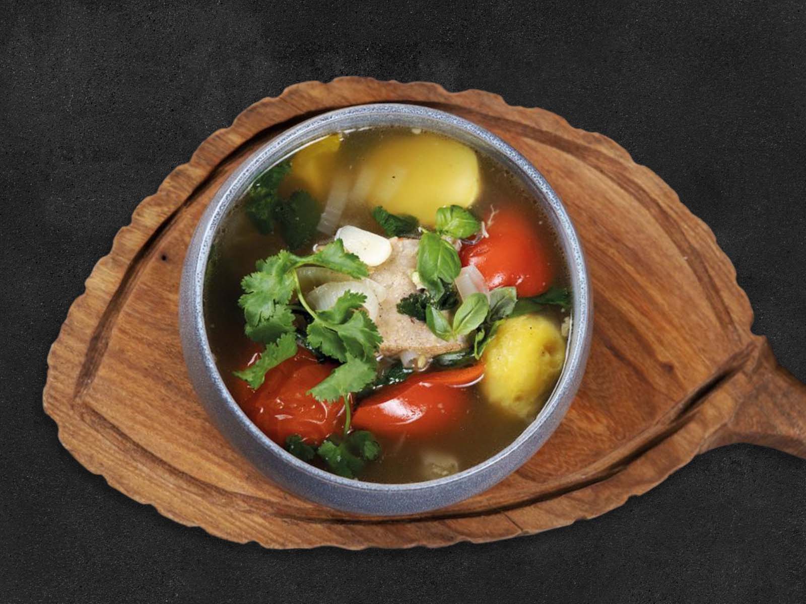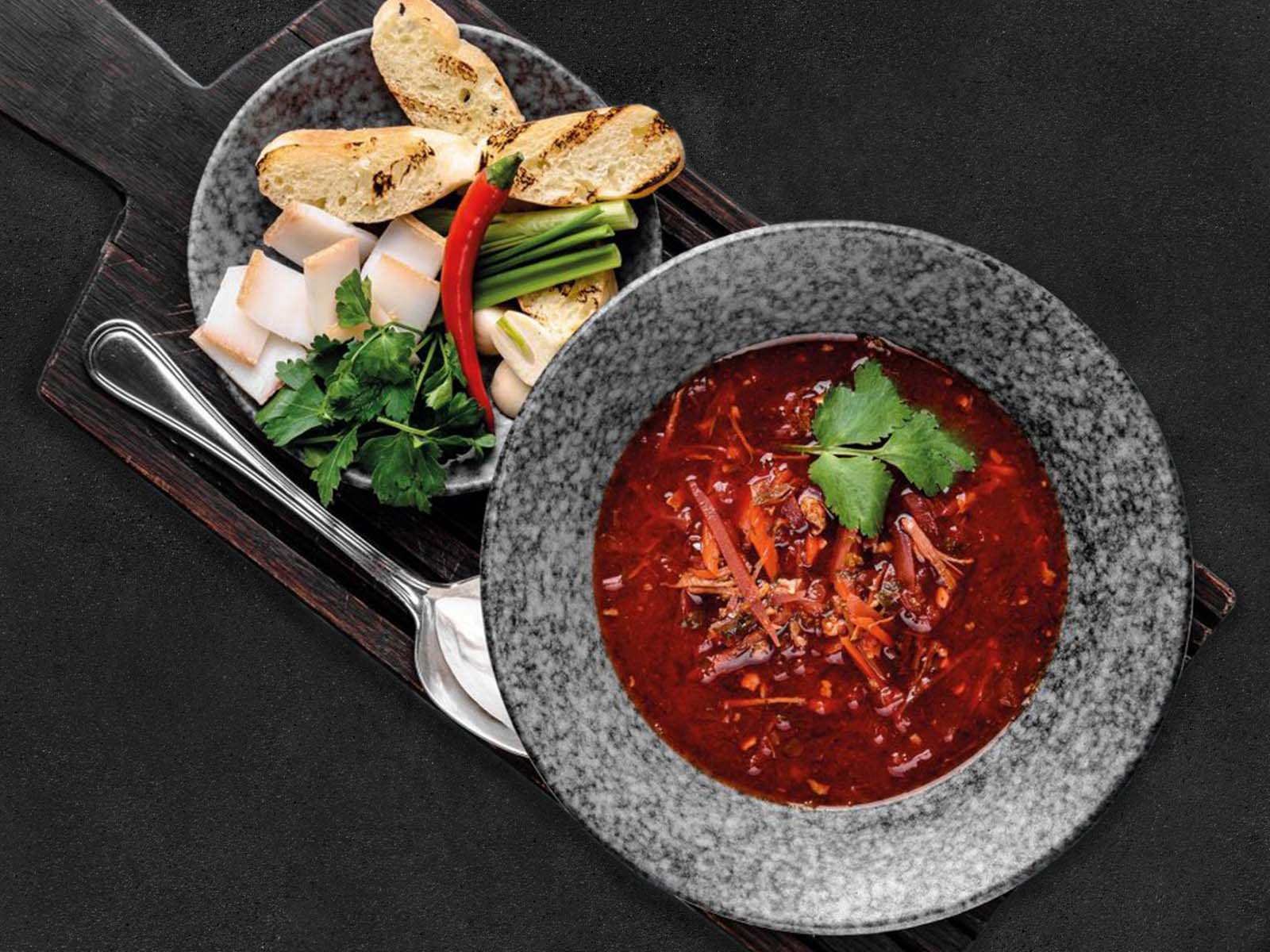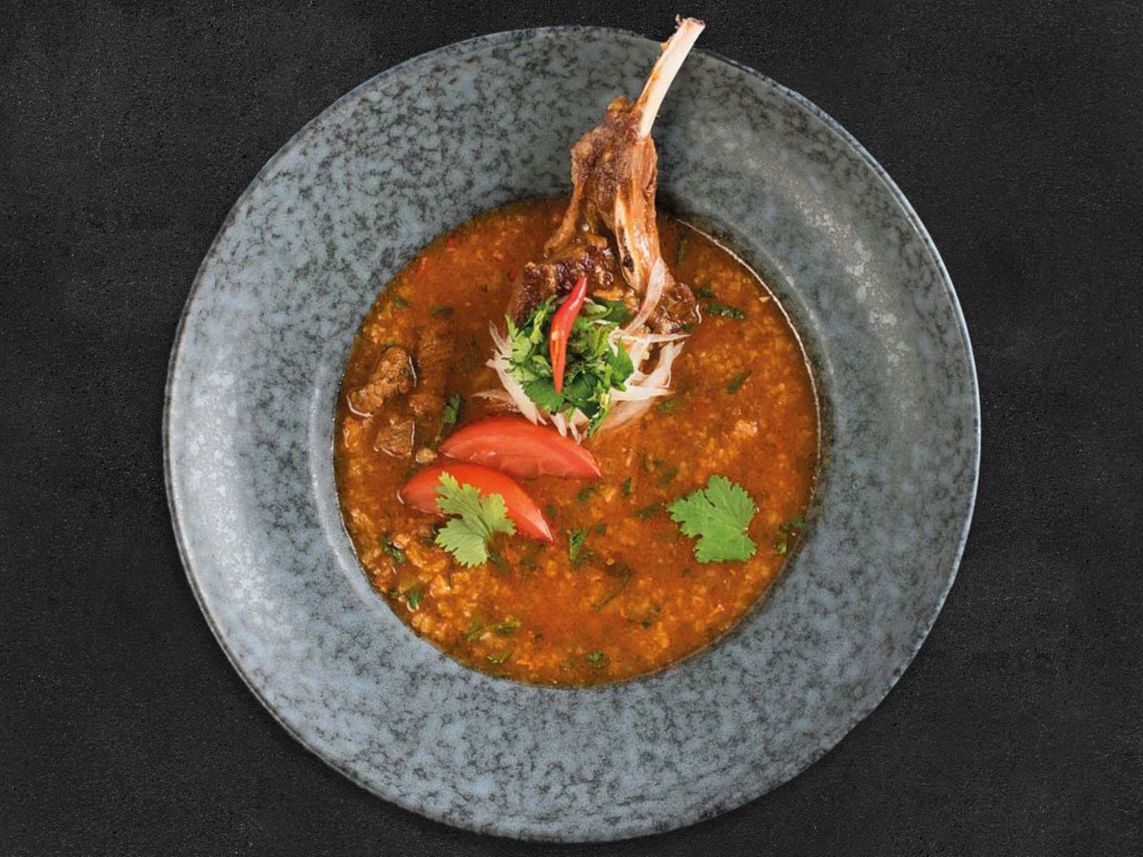 Традиционный суп со специями, телятиной и рисом, а также кинзой, красным перцем, приправой уцко-сунели, хмели-сунели, чесноком, кориандром, базиликом и томатами. По желанию гостя можем приготовить с каре ягненка. Остро!