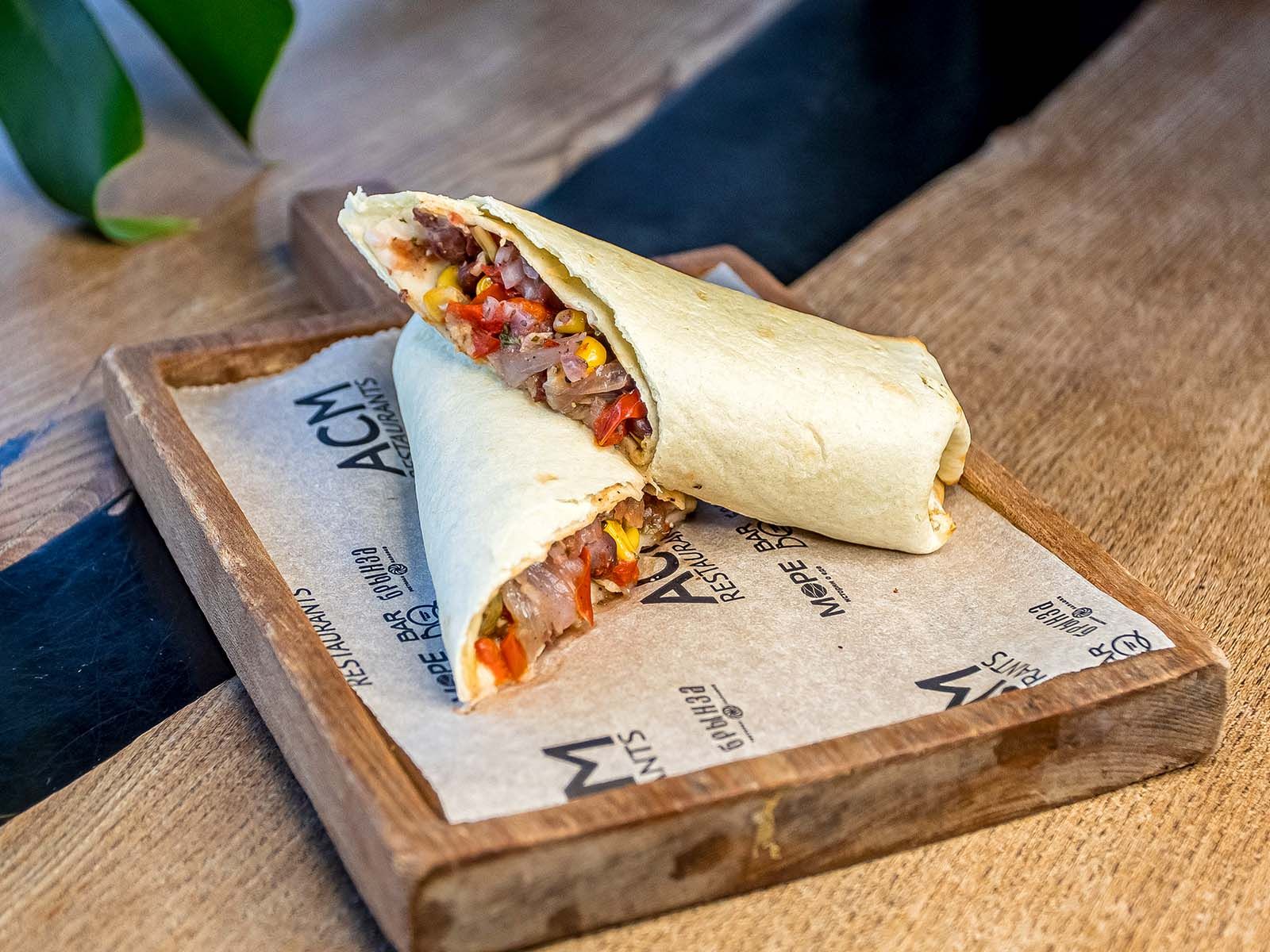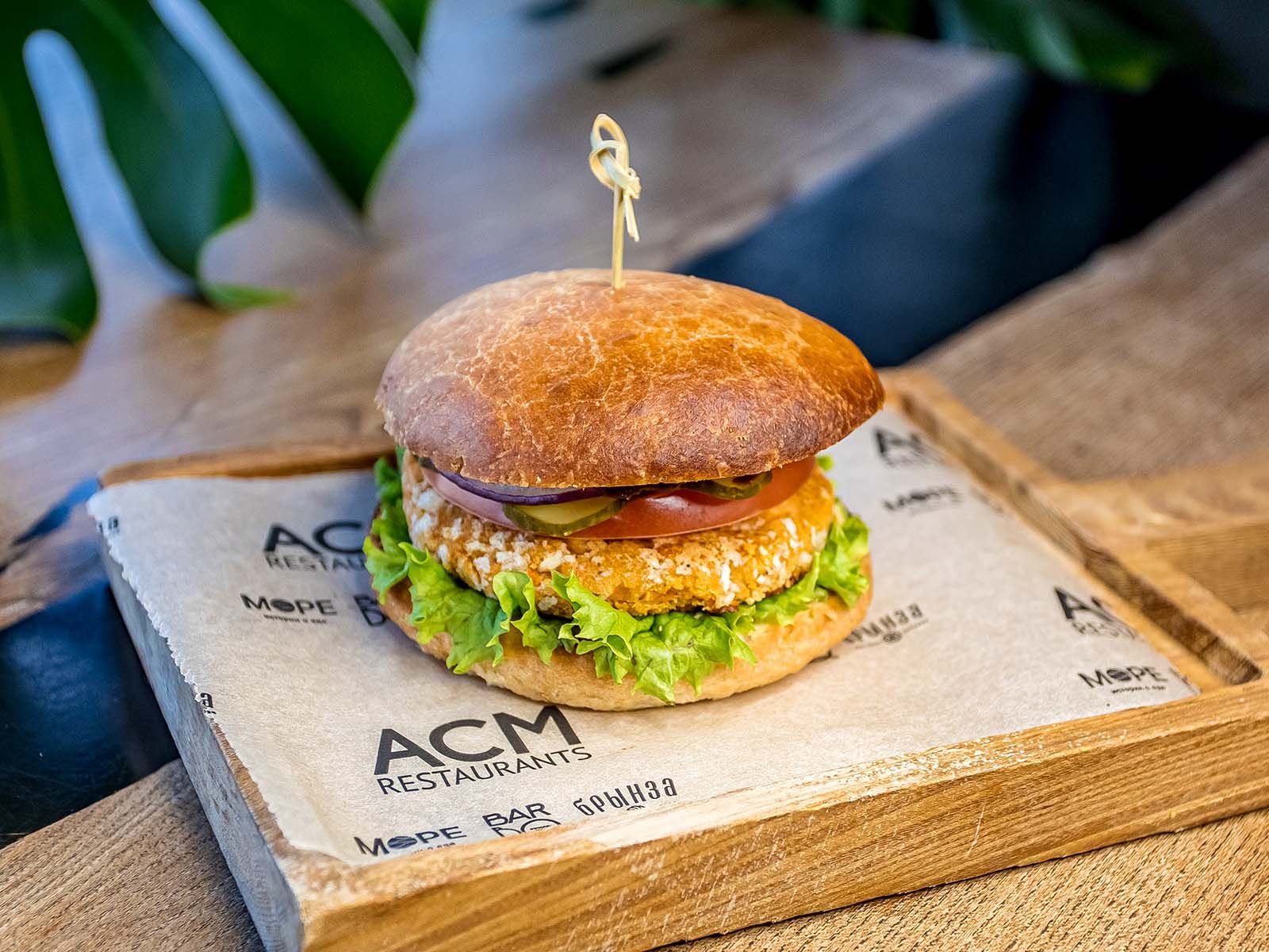 Бургер с сочной котлетой из говядины, котлетой из сыра моцарелла, свежими овощами, маринованным луком и фирменным соусом.