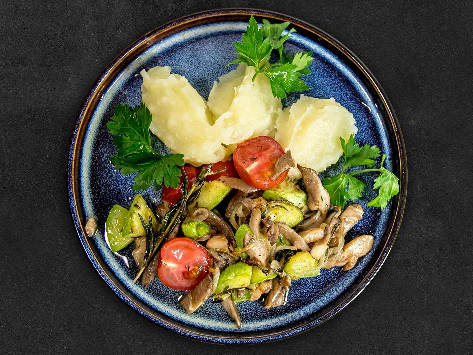Нежная телятина, обжаренные овощи и шампиньоны.