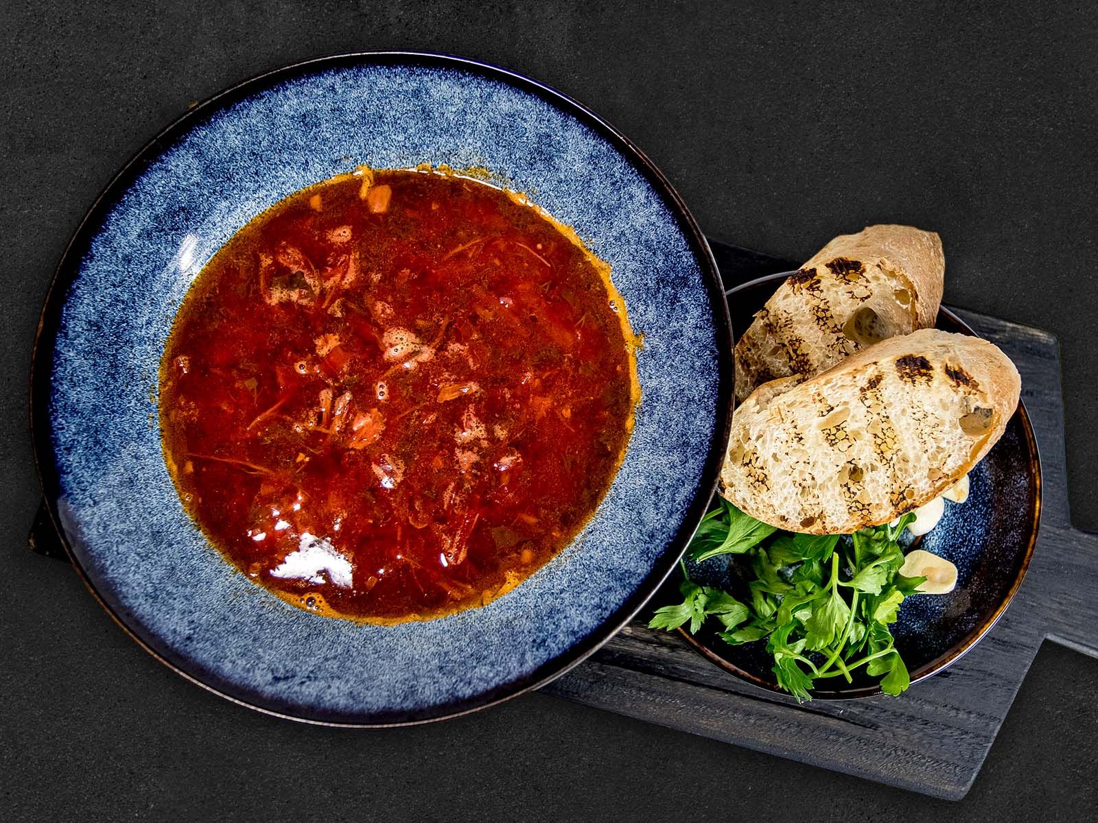 Наваристый суп с телятиной. Подается с фермерской сметаной, зеленью, салом, чесноком и хрустящим багетом. Остро!