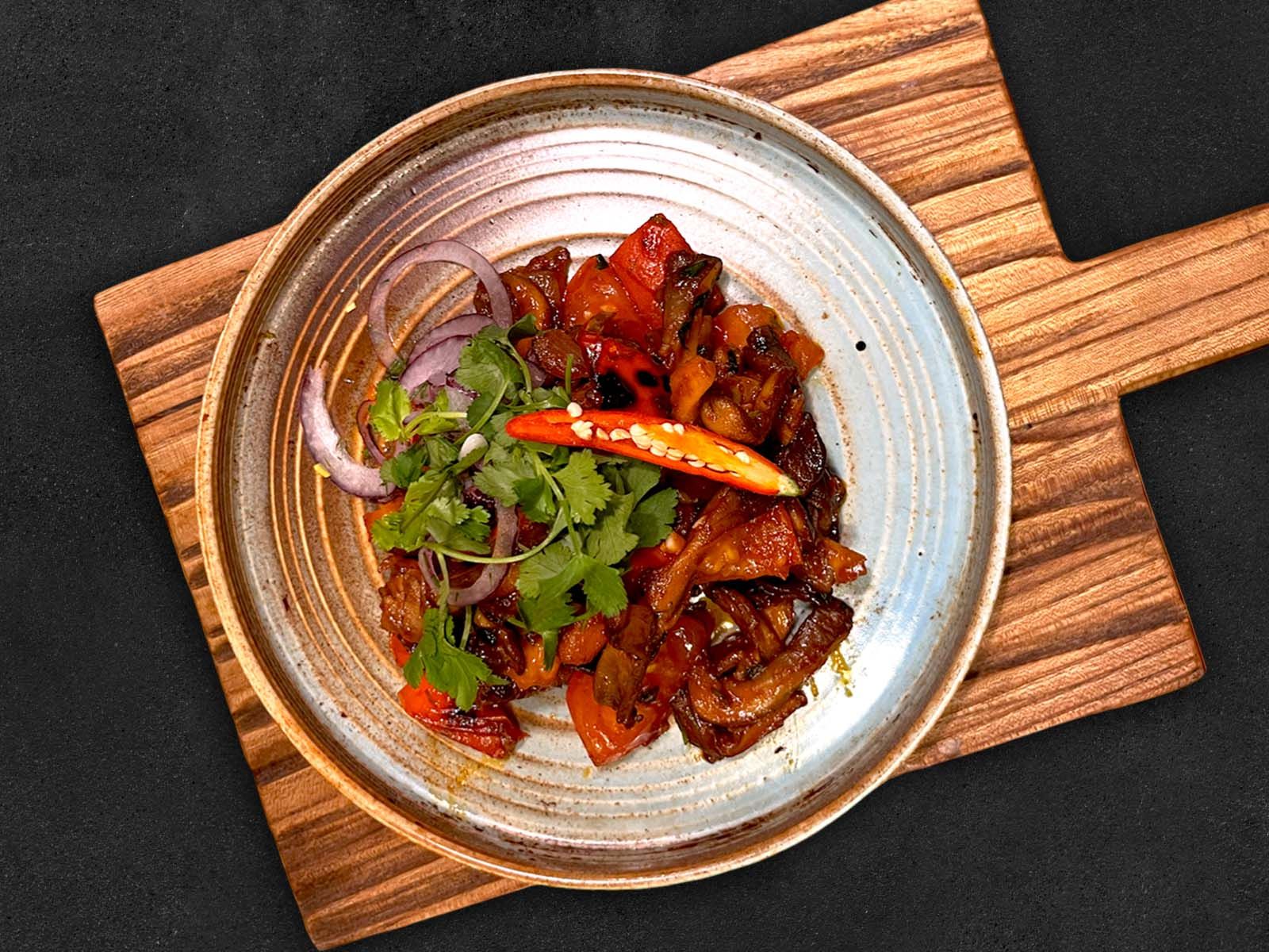 Отварная курица с грецким орехом и жареным баклажаном под пряном соусом