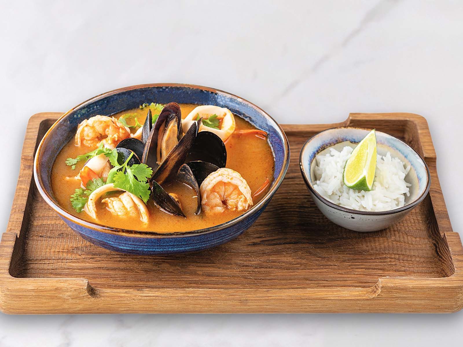Обжаренные на сковороде с добавлением белого вина, сливок и соуса Том-ям. Подаются с хрустящим багетом, обжаренным в хоспере