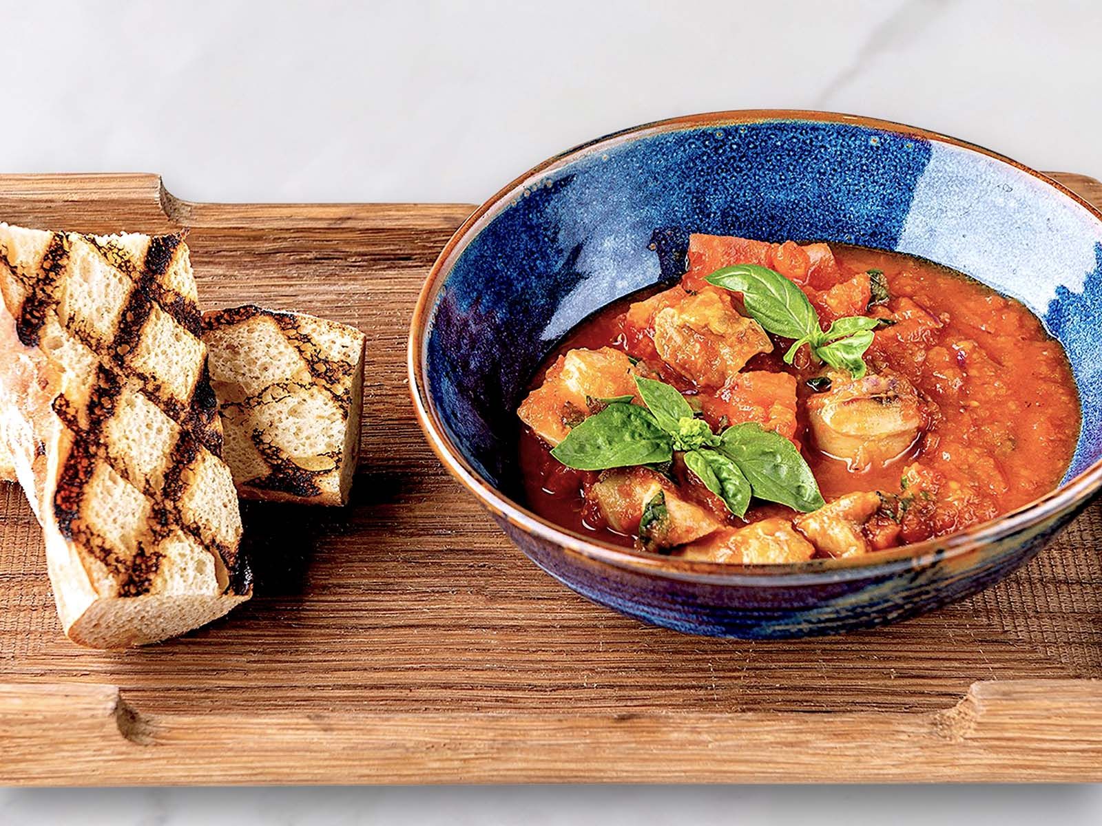 Черноморская рапана, тушенная в томатном соусе, с хрустящим багетом
